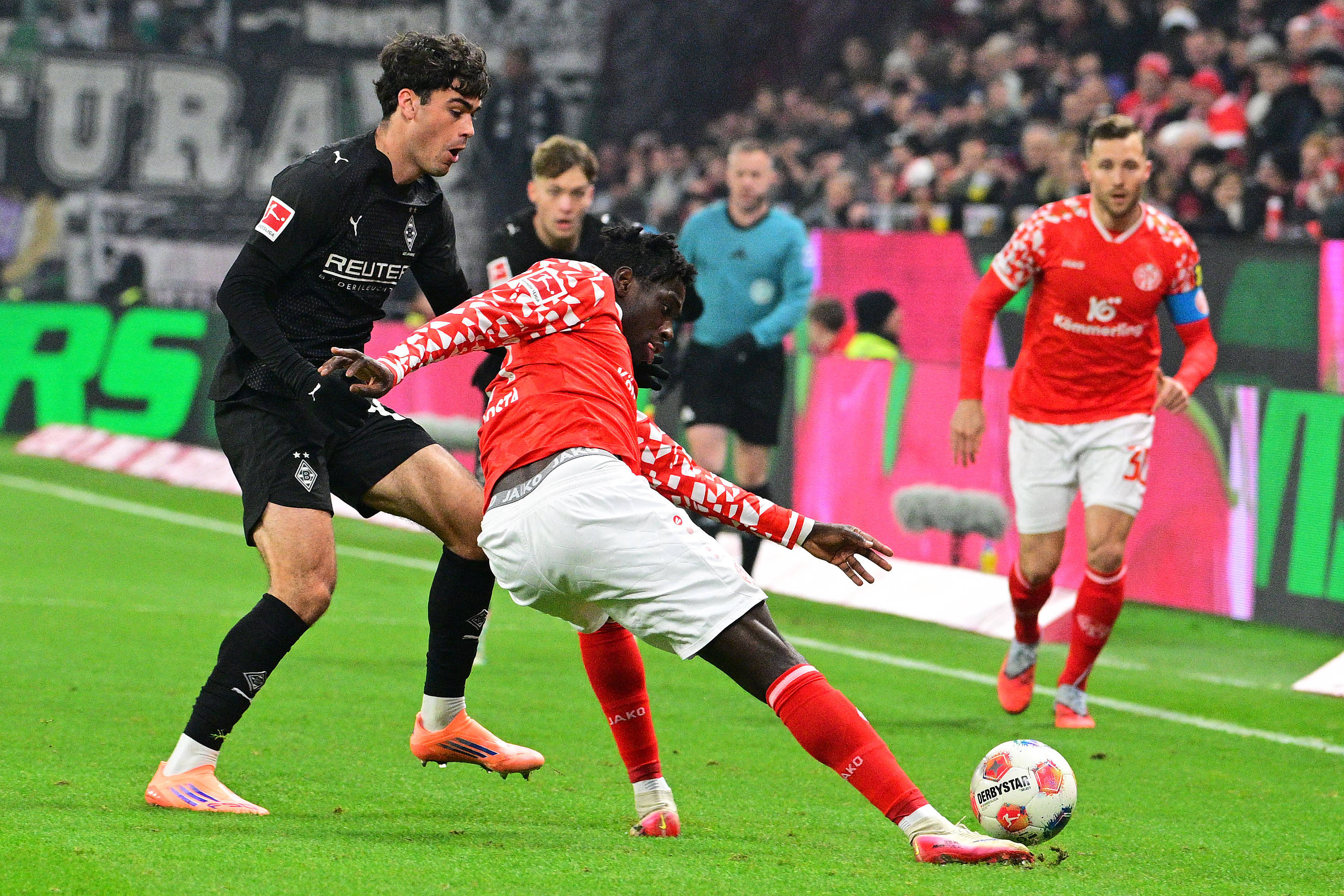 12月5日,美因茨队球员科斯塔(中)和门兴格拉德巴赫队球员雷纳在比赛中拼抢。 新华社发(乌尔里希·胡夫纳格尔 摄)